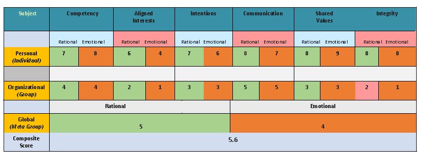 The Optimal Trust Grid is flexible. It adapts to the unique context of each survey. Consequently, the X-axis on the O.T. Grid uses any number of Trust Components. In the example below, the O.T. Grid consists of six Components. (Competency, Aligned Interests, intentions, Communications, Shared Values, and Integrity.)