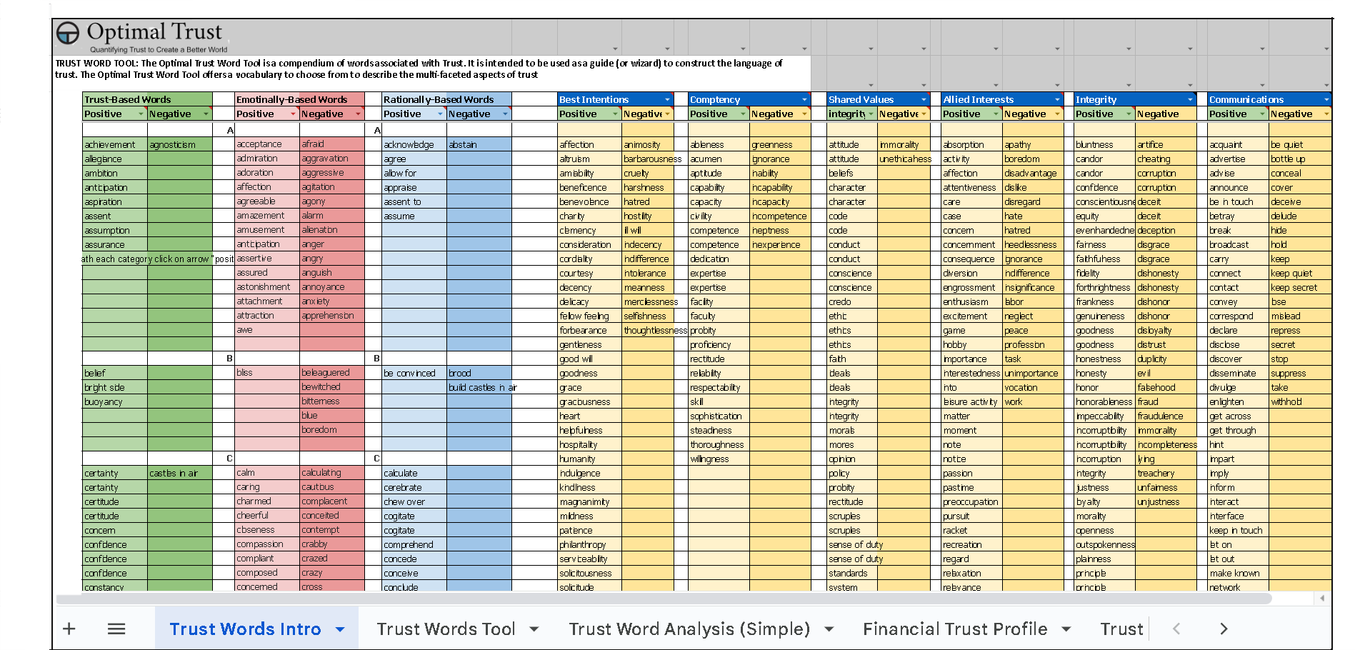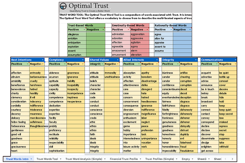 The Optimal Trust (O.T.) technology draws upon a large lexicon of trust-related words to generate questions that pertain to specific trust components across all levels. This embedded lexicon also empowers the evolving Machine-Learning-based technology to analyze text-based language in detail. Through its linguistic and analytical capability, the O.T. technology enables precise quantitative - and qualitative - data measurement.